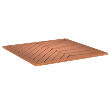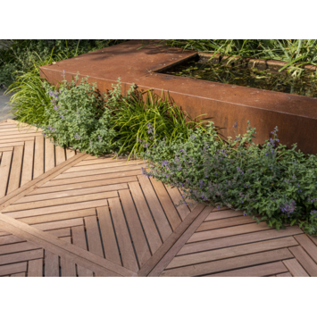 De vlondertegel hardhout visgraat is 2,4 cm hoog, 100 cm breed en 100 cm diep. De vlondertegel bestaat uit 27 gladde planken die in visgraatmotief in een lijst, bovenop 7 latten zijn vastgeschroefd. Om corrosie van de schroeven te voorkomen zijn de gaten en schroeven afgedicht met parafine. Monteer de vlondertegel met zelf borende RVS schroeven. De vlondertegel is gemaakt van onbehandeld Keruing. De houtsoort Keruing is afkomstig uit Zuidoost-Azië en is licht roodbruin tot donker roodbruin van kleur. Keruing hout valt in duurzaamheidsklasse 3 en heeft onbehandeld een levensduur van circa 10 tot 15 jaar. Het Keruing hout is geschaafd en kunstmatig gedroogd om scheurvorming te voorkomen.