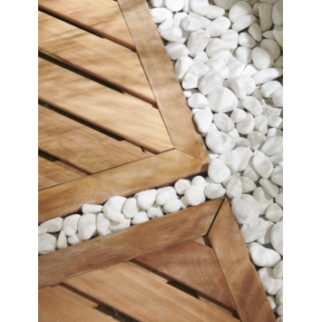Onlangs deze hardhouten terrastegels gekocht. De latjes aan de achterkant lieten bij sommige tegels snel los en moesten opnieuw worden geschroefd. Ik hoop dat de latjes het houden, want ze zakken toch wel erg door. Nu zijn we gelukkig zelf niet al te zwaar, maar bij visite houd ik m'n hart vast..... De tegels liggen allemaal op houten balken en zijn op alle hoeken vastgeschroefd.