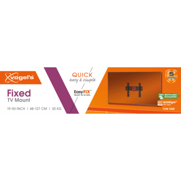 Zoek je een snelle, eenvoudige oplossing om je tv strak tegen de muur te hangen? Hoeft je toestel niet te kunnen draaien of kantelen? Dan is deze Vogel’s QUICK Fixed muurbeugel de perfecte keuze. In 3 simpele stappen hangt je tv stevig aan de muur. Installeren kost je hooguit 20 minuten, zo eenvoudig is het. De Vogel’s QUICK Fixed tv beugel is geschikt voor tv’s van 19 t/m 50 inch met een gewicht van maximaal 30 kg. Alle montagematerialen om je tv op te hangen worden meegeleverd in de verpakking: boormal, schroeven en pluggen. Daarnaast kun je gebruikmaken van Vogel’s gratis DrillRight™ AR App. Hiermee teken je eenvoudig je eerste boorgat af. Het unieke SoftLock™ systeem zorgt voor een veilige borging van je tv. Daarnaast is elke Vogel’s QUICK Fixed muurbeugel getest op driemaal het maximale tv-gewicht en TÜV-gecertificeerd. Veiliger kan je tv niet hangen. Op Vogel’s QUICK Fixed tv beugel zit 5 jaar garantie.