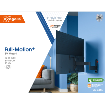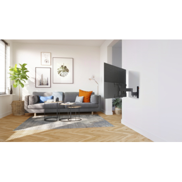 Het scherm van je OLED-tv is kwetsbaar en extreem dun. Daarom hebben we de COMFORT Full-Motion+ tv-beugel ontworpen voor een soepele draaibeweging. Met onze One-Finger™ Movement technologie kun je je OLED-scherm met slechts één vinger in de gewenste positie draaien. Wil je weten hoeveel je OLED-tv kan draaien? Vul je tv-type in op deze pagina en onze tool berekent direct de werkelijke draaihoek.