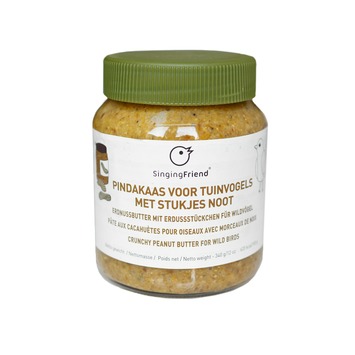 Vogelpindakaas 340 gram is zeer geschikt voor het voederen van vogels. De pot heeft een inhoud van 340 gram en een handige draaideksel. Het verschil met echte pindakaas is het lagere zoutgehalte. Vooral in de winter hebben vogels meer vette voedingsstoffen nodig. Deze pindakaas met noten is geschikt ter aanvulling op hetgeen vogels in de natuur vinden. De pot vogelpindakaas kan in Vogelvoeder Evie worden gezet, ook verkrijgbaar in geselecteerde bouwmarkten.