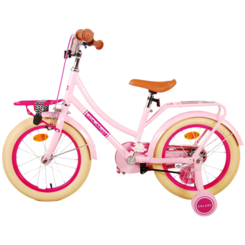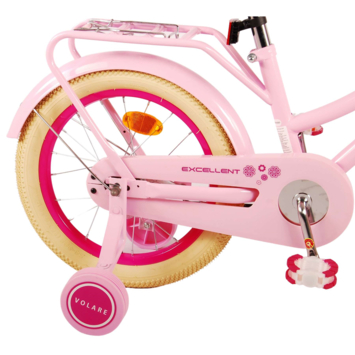 Met de Volare Excellent 16 inch kinderfiets wordt leren fietsen een waar plezier! Deze prachtige roze fiets biedt alles wat een jonge fietser nodig heeft. Voor optimale veiligheid is de fiets uitgerust met een handrem, terugtraprem, een gesloten kettingkast en afneembare zijwieltjes.