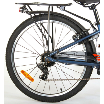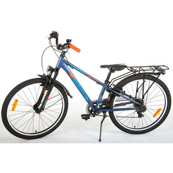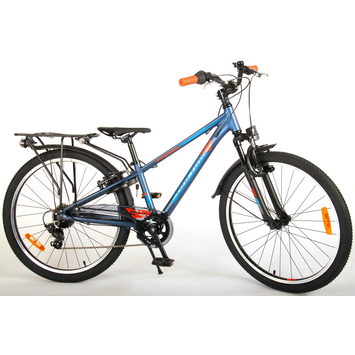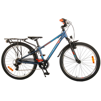 Volare Cross 24 inch kinderfiets. De Volare Cross kinderfietsrange is van superieure kwaliteit. Het aluminium geometrische frame in de stoere kleurstelling blauw groen maakt van deze fiets een echte eyecatcher. Met de 6 versnellingen kan gemakkelijk extra vaart worden gemaakt. Om snelheid te verminderen heeft de fiets een veilig aluminium V-remsysteem met twee handremmen (geen terugtraprem!). De handvaten zijn van Kraton, een heerlijk zacht rubber, waardoor deze lekkerder in de hand liggen en extra comfort bieden. Op de achterdrager kunnen alle belangrijke spulletjes mee worden genomen. Voor de veiligheid heeft de fiets verlichting aan de voorkant en achterkant en bovendien beschikt de fiets over een fietsslot. Verder heeft de fiets aluminium velgen met stalen spaken en een sterk standaard en een fietsbel. De fiets is voor 85% afgemonteerd. De 24 inch luchtbanden maken deze fiets geschikt voor jongens tussen de 8 en 10 jaar oud met kledingmaat 128-140. Iedere jongen wil op deze fiets naar school crossen! Vroemmm!