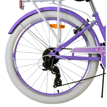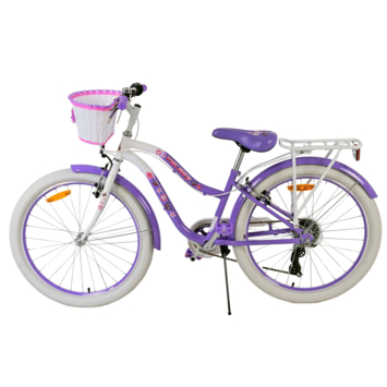 De Volare Lovely 24 inch kinderfiets in wit en paars is de perfecte metgezel voor je kind, of het nu naar school is of naar vriendjes. Deze stijlvolle fiets heeft een coole uitstraling en biedt veiligheid met twee handremmen, reflectoren voor, achter en in de wielen, en een bel. Dankzij de 7 versnellingen is de fiets geschikt voor verschillende terreinen en zorgt hij voor een soepel rit, zowel in de stad als op de fietspaden.