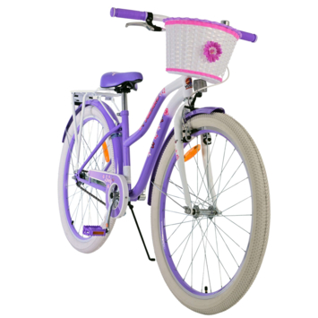 De Volare Lovely 26 inch kinderfiets in paars en wit maakt elke rit naar school of naar vrienden een feestje! Deze fiets is ontworpen met veiligheid in gedachten, met zowel een handrem als een terugtraprem voor optimale controle. De reflectoren aan de voor- en achterkant, evenals in de wielen, zorgen ervoor dat je kind goed zichtbaar is, zelfs in het donker. De fiets is verder uitgerust met een vrolijk mandje en een handige achterdrager, zodat er ruimte is voor wat extra spullen.