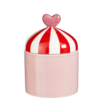 De voorraadpot roze met hartje 20,5 x Ø 14 cm is een vrolijke blikvanger in de keuken. De roze basis met rode en witte accenten zorgt voor een speels en feestelijk effect. Ideaal om lekkernijen zoals kerstkoekjes, chocolaatjes of snoepjes in te bewaren, maar ook praktisch voor kleine keukenspulletjes.