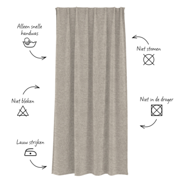 Dit gordijn kun je in de wasmachine wasssen op een fijnwasprogramma van 30°C en evt. lauwwarm strijken. Dit gordijn kan niet in de centrifuge en droger.