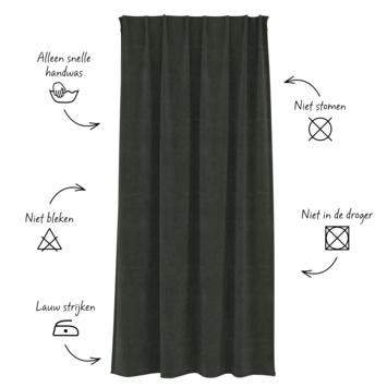 Dit gordijn kun je in de wasmachine wasssen op een fijnwasprogramma van 30°C en evt. lauwwarm strijken. Dit gordijn kan niet in de centrifuge en droger.