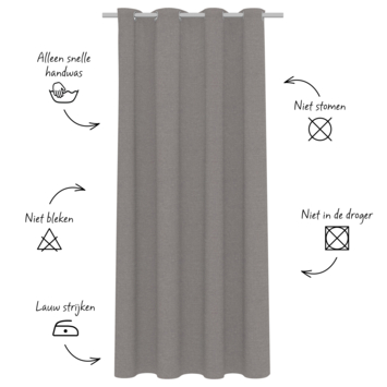 Dit gordijn kun je in de wasmachine wasssen op een fijnwasprogramma van 30°C en evt. lauwwarm strijken. Dit gordijn kan niet in de centrifuge en droger.