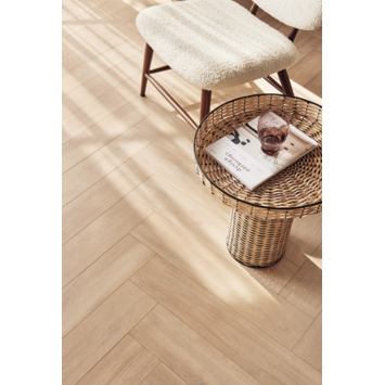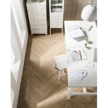 Ontdek de perfecte harmonie tussen elegantie en functionaliteit met het vtwonen laminaat Rafter visgraat beige bruin. De visgraat kleur geeft de vloer een rustieke uitstraling passend bij een verscheidenheid aan interieurstijlen. Het betreft een visgraat vloermotief, waarbij het cruciaal is om de legvoorschriften van deze laminaatvloer nauwgezet op te volgen om lang plezier van de vloer te garanderen. Door de voelbare houtstructuur met V-groeven aan alle zijden oogt de laminaatplank als een authentieke plank. Met de klikverbinding leg je de laminaatvloer eenvoudig en naadloos zwevend, omdat deze niet op de ondervloer hoeft te worden verlijmd. De laminaatvloer is in combinatie met de juiste ondervloer prima geschikt voor eventuele vloerverwarming aan de hand van warmwaterbuizen. Het matte laminaat kan daarbij eventueel gebruikt worden als vloer voor de trap. Het supersterke basismateriaal HDF (High Density Fiberboard) is PEFC gecertificeerd, wat betekent dat het hout afkomstig is uit duurzaam beheerde bossen. Laminaat is bovendien makkelijk te reinigen en daarmee zeer onderhoudsvriendelijk. De laminaatvloer heeft een dikte van 8 mm, wat bijdraagt aan een goede stabiliteit en het product geschikt maakt voor zowel intensief woongebruik als normaal commercieel gebruik. De verpakking bevat 14 lamellen wat resulteert in een totale inhoud van 1.24 m².