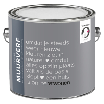Wil je kleur in huis? Dan zit je goed met de verfcollectie van vtwonen. Deze hoogwaardige, uitstekend dekkende muurverf heeft een matte krijtlook voor een maximaal poederachtige krijtverf uitstraling. De vtwonen muurverf krijtlook mat ocean 2,5 liter is op waterbasis en geschikt voor muren en plafonds, niet geschikt voor badkamers en vochtige ruimtes.