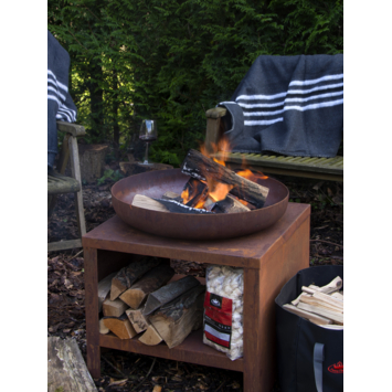 Een vuurschaal die niet alleen warmte geeft, maar ook meteen een eyecatcher is? Deze roestkleurige vuurschaal met houtopslag combineert stijl en functionaliteit moeiteloos. Dankzij de verhoogde schaal heb je altijd zicht op het vuur, terwijl je onderin genoeg ruimte hebt om hout op te slaan. Handig én sfeervol. Door weer, vuur en tijd krijgt het staal een steeds authentiekere uitstraling. Ideaal voor lange avonden in de tuin met vrienden, familie of gewoon met z’n tweeën. Afmetingen: 80,5 x 80,5 x 63,2 cm.