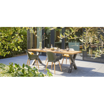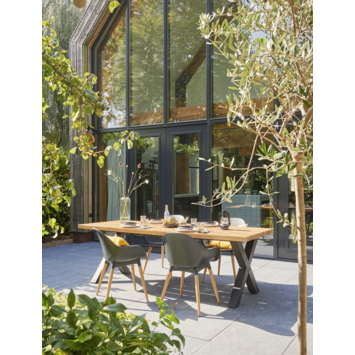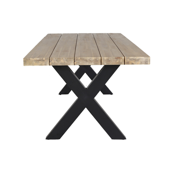 Het blad is vervaardigd uit light teak acacia hout, wat zorgt voor een warme en natuurlijke uitstraling. De lichte houtkleur benadrukt de schoonheid van het materiaal en past perfect in diverse tuinomgevingen. Het zwart poedergecoate metalen onderstel voegt een moderne en industriële touch toe en zorgt tegelijkertijd voor stabiliteit en stevigheid.