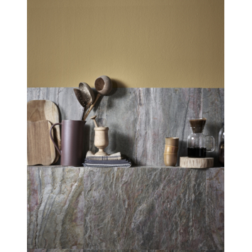 Dit natuursteen fineer is een licht, flexibel paneel van 40x60 cm wat is vervaardigd van authentiek natuursteen uit India. De combinatie van grijstinten en warme aardetinten als goudgeel en Indisch rood creëren een bijzonder warme uitstraling. De textuur van het paneel komt uitermate goed tot zijn recht door de finesse van het natuurlijke karakter. Het kwartsiet in het gesteente zorgt voor een subtiele, natuurlijke glitter en glans. Er zijn geen toevoegingen gedaan aan de textuur, kleur of pigmentaties, hierdoor is elk paneel uniek.