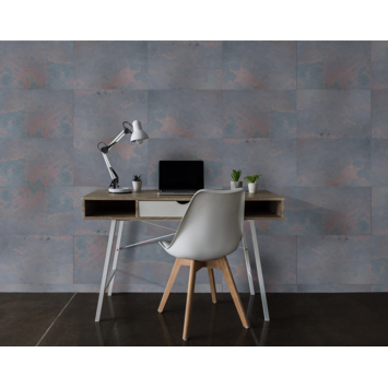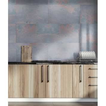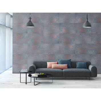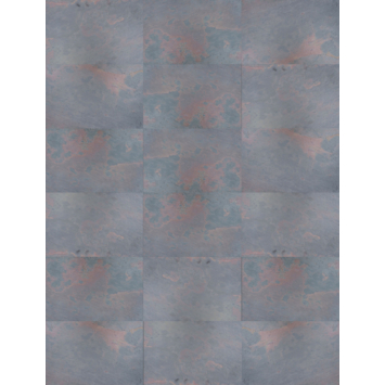 Dit natuursteen fineer is een licht, flexibel paneel van 40x60 cm wat is vervaardigd van authentiek natuursteen uit India. De combinatie van vergrijsde blauwtinten en Indisch rood creëert een bijzonder warme uitstraling. De textuur van het paneel komt uitermate goed tot zijn recht door de finesse van het natuurlijke karakter. Het kwartsiet in het gesteente zorgt voor een subtiele, natuurlijke glitter en glans. Er zijn geen toevoegingen gedaan aan de textuur, kleur of pigmentaties, hierdoor is elk paneel uniek.