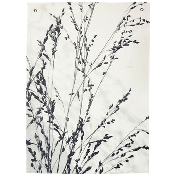 Wandkleed met print wit/zwart 140x100 cm. Een mooi statement voor in huis. De nonchalante "drape" is een alternatief in wanddecoratie. Deze print van gras tegen een lichte achtergrond geeft een mooie sfeer en brengt wat mer natuur in je interieurs. Door de metalen nestels is ophangen eenvoudig.