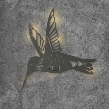Dit wandornament in de vorm van een kolibrie is een eyecatcher voor jouw tuin. Hang hem op aan de muur of schutting en het zal direct voor sfeer zorgen. De lamp is voorzien van een solar paneel die gedurende de dag, zodra de zon erop schijnt oplaad. Zodra het donker wordt zal het wandornament tot 6 uur branden. De LED lamp is voorzien van warm wit licht.