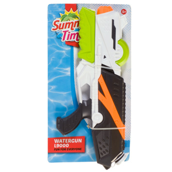 Summertime waterpistool, in de kleurencombinatie oranje, lime, zwart en wit. Met handvat aan de bovenzijde en waterreservoir met afsluitdop. Functioneert met pompmechanisme. Lengte: 47 cm. Inhoud: 750 ml. Verpakt op kaart. Geschikt voor kinderen vanaf 5 jaar.