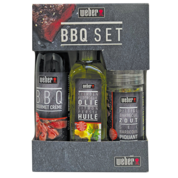 Geef je barbecuegerechten een extra smaakdimensie met de Weber kruidenset 3-delig. De set bestaat uit een verrukkelijke BBQ Gourmet saus, citroen-peterselie olie en een pittige barbecue zoutmolen. Dit alles zit verpakt in een leuke giftbox, perfect om als cadeau te geven of om gewoon lekker zelf te gebruiken.