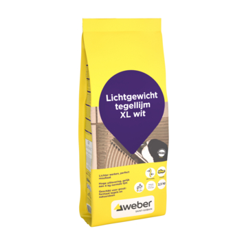 Extra makkelijk tegelen met de Weber Beamix lichtgewicht tegellijm XL wit 2,5 kg. Deze witte lichtgewicht poeder tegellijm is net zo sterk als andere tegellijm, maar weegt stukken minder. En je haalt bovendien evenveel kleefcement uit één zak ten opzichte van andere traditionele tegellijmen in grotere zakken. Flexibel, lichtgewicht, stofarm én ideaal voor het verlijmen van grootformaat tegels en natuursteen op wanden en vloeren, binnen en buiten. De lichtgewicht tegellijm is geschikt voor verlijming van tegels op beton, zandcement, oude tegels, kalkzandsteen, stucwerk, gipsplaten, hout en op vloeren met vloerverwarming. Maak het jezelf makkelijk en kies voor de lichtgewicht tegellijm XL wit.