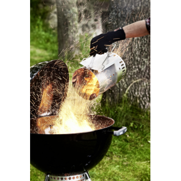 Met deze brikettenstarterset van Weber steek je je houtskoolbarbecue snel en gelijkmatig aan. Je vult de cilinder tot driekwart met briketten en plaatst deze bovenop een paar brandende aanmaakblokjes. Na 15 tot 30 minuten zijn de kolen witheet en klaar voor gebruik. Je keert de starter om en laat de gloeiende briketten rustig in de barbecue glijden. Zo heb je in één beweging een gelijkmatige hitteverdeling, zonder vloeibare aanmaakmiddelen of extra accessoires. De starter is van staal en bestand tegen hoge temperaturen. Dankzij het handvat houd je controle bij het omkeren. Met een hoogte van 31,75 cm en een breedte van ruim 20 cm past hij op vrijwel elke houtskoolbarbecue.