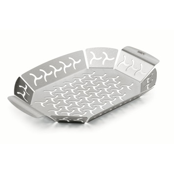 De Weber groentekorf klein is geschikt voor de aromatische bereiding van kleinere of gesneden groenten. Ook kun je hierin andere kleinere gerechten bereiden. Door het kleine rooster kunnen de sappen afdruipen en zullen je groenten er niet doorheen vallen. Door gebruik van deze groentekorf zullen je groenten niet aanbranden op de barbecue. Het gepatenteerde design van de korf vermindert vervorming en zorgt ervoor dat je het langdurig kunt gebruiken. De korf is 26,4 bij 20,3 bij 3,2 centimeter groot.