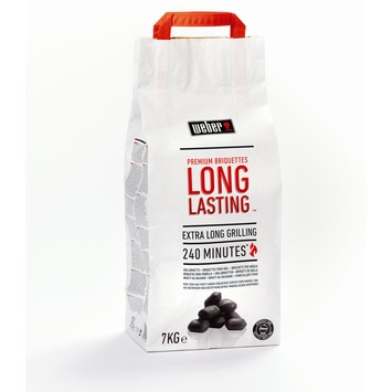 De Weber Premium Long Lastig Briketten 7KG hebben een extra lange brandtijd tot 240 minuten (4 uur). Briketten zijn daarom erg geschikt voor grote braadstukken met lange gaartijden, denk bijvoorbeeld aan het braden van kip.