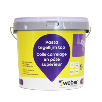 De Weber Saint Gobain pasta tegellijm Top is een kant-en-klare tegellijm die binnen toegepast kan worden. Je kunt deze tegellijm ook gebruiken voor vochtige ruimtes zoals een badkamer of garage, maar niet onder water (zwembaden) worden toegepast. De lijm is geschikt voor het verlijmen van vele soorten keramische tegels op vrijwel alle soorten ondergronden, zoals cement, beton, gipsplaten, gipsvezelplaten, pleisterlagen en kalkzandsteen. Je kunt hiermee wandtegels van maximaal 35x35 cm verlijmen. Het verbruik van deze lijm is circa 1,5 tot 2,5 kg per vierkante meter bij toepassing van normale wandtegels op vlakke ondergronden. De lijm wordt geleverd in een handige emmer van 4 kg, zodat je genoeg hebt voor ca. 1,6 tot 2,7 m2.