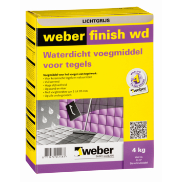 Het Weber Saint Gobain tegel voegmiddel is een universeel toepasbaar waterdicht voegmiddel voor keramische wand- en vloertegels en voor natuursteen. Je kunt dit voegmiddel gebruiken voor voegbreedtes van 2 tot 20 mm. Het voegmiddel is gemakkelijk aan te maken met leidingwater en kan zowel binnen- als buiten worden toegepast. Tevens is het voegmiddel te gebruiken in vochtige ruimtes. Met dit voegmiddel kun je afhankelijk van de voegbreedte ca. 11 m2 tegelwerk voegen.