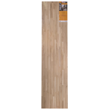 Dit werkblad van gevingerlast eiken hout kan worden gebruikt voor bijvoorbeeld het maken van een leuk bureau of werktafel. Het blad heeft een afmeting van 250x61 cm en de dikte is 26 mm.