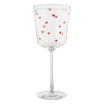 Dit is het perfecte wijnglas om met je dierbare personen mee te proosten! Het glas is namelijk versierd met rode hartjes - schattig! Hij heeft een klassiek uiterlijk door de smalle en hoge kelk en de lange steel zorgt ervoor dat hij lekker in de hand ligt en je wijn niet warm wordt. De rode hartjes geven het glas een charmant en lief uiterlijk, perfect voor een intiem diner, een feestelijke gelegenheid of gewoon om je dag wat extra liefde te geven. De afmetingen zijn H22 xø8 cm.