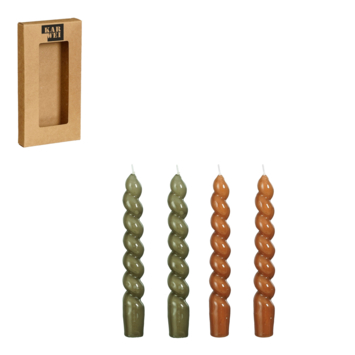 Deze trendy Twist dinerkaarsen geven elke kandelaar een bijzondere uitstraling, vooral in combinatie met de glanzende donkergroene en bruine kleuren! Ze zijn erg leuk om 's avonds aan te steken, maar dienen ook overdag als decoratief element. De set bevat vier kaarsen, gemaakt van paraffine. De kaarsen hebben de afmetingen H19 xø3 cm.