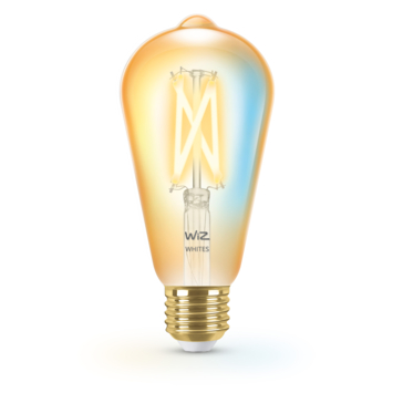 Breng gemakkelijke, slimme verlichting in huis. Deze goudkeurige, bijzonder sfeervolle WiZ LED-filamentlamp geeft zowel warm- als koelwit licht, dat je helpt met ontspannen of juist concentreren. Je kunt timers instellen die je lampen automatisch in- of uitschakelen, gebaseerd op jouw dagritme. Bijvoorbeeld helder wit licht in de ochtend en zacht warm licht in de avond. Je kunt ze bedienen met je smartphone of stem, zelfs als je niet thuis bent. WiZ lampen werken op je eigen wifinetwerk. Meer heb je niet nodig. Deze lamp heeft een E27-fitting, en past dus in de meeste lampen met grote fitting.e