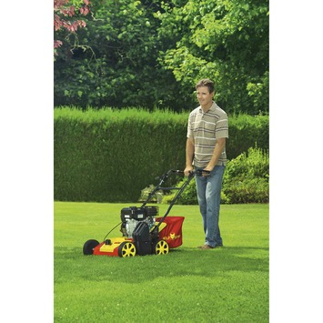 De Wolf-Garten benzine verticuteermachine VA357B haalt met gemak dode stukken gras en mos weg. De verticuteermachine heeft 14 scherpe messen met een grote maaibreedte van 35 cm die zonder enige moeite ongezond gras en mos weg halen. Je gazon krijgt hierdoor meer ruimte voor nieuw gras en kan voedingsstoffen beter opnemen. De 6 dieptestanden instelling zorgen ervoor dat je zelf kan kiezen hoe diep je in het gras wilt snijden. De Wolf-Garten machine heeft een B&S 500 serie motor die werkt op benzine met een vermogen van 127cc en 3600 tpm en is hierdoor een krachtig apparaat. De opvangzak heeft een ruime inhoud van wel 45 liter en zorgt dat je zonder te veel onderbrekingen je klus kan klaren. Deze machine heeft een 3-in-1 werking en kan naast verticuteren, ook mos losharken en opvangen. De duwboom met softgrip zorgt dat je comfortabel kan werken. Ook is de duwboom inklapbaar en daardoor is de verticuteermachine gemakkelijk op te bergen. De Wolf-Garten benzine verticuteermachine VA357B is een krachtig apparaat die zorgt voor een gezond gazon.