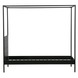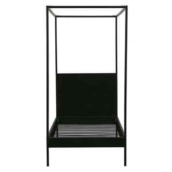 Het hoofdbord van dit hemelbed is van geschuurd grenen in een matte diepzwarte kleur.