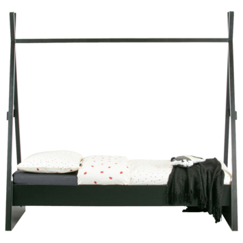 Gezellig is het zeker, een tikkeltje stoer ook! Dit Joep juniorbed om in te slapen uit de collectie van het merk WOOOD. Het bed is gemaakt van grenen dat is afgewerkt in een stoere zwarte kleur. Het is als slapen in een tent, maar dan in je eigen kamer. Welk kind wilt dit nou niet?! Om het bed nog gezelliger te maken kun je er ook een (licht)slinger aan ophangen.