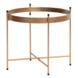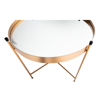 Faris bijzettafel heeft een slank, rond metalen frame, uitgevoerd in de kleur antique brass. Het ronde tafelblad is een spiegel. Je kunt Faris als bijzettafel gebruiken voor je kopje koffie en je boek, maar door het heldere spiegelblad, is het ook een gave display voor een favoriet accessoire, een prachtige bos bloemen of een mooie plant.