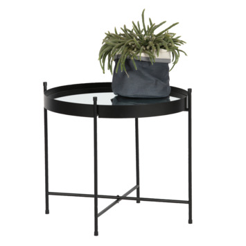Faris bijzettafel heeft een slank, rond metalen frame, uitgevoerd in zwart. Het ronde tafelblad is een spiegel. Je kunt Faris als bijzettafel gebruiken voor je kopje koffie en je boek, maar door het heldere spiegelblad, is het ook een gave display voor een favoriet accessoire, een prachtige bos bloemen of een mooie plant.