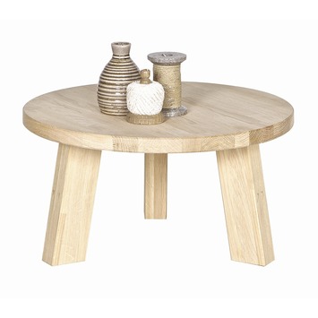 De WOOOD bijzettafel Rhonda 60x60x30 cm is een rond massief eiken bijzet- en/of salontafel met een diameter van 60 cm en een van hoogte is 30 cm. Door het hoogteverschil van circa 3 cm met de andere Rhonda bijzettafels (hoogte 27 cm of 33 cm) kunnen deze op een leuke manier gecombineerd worden tot een set van twee of drie tafels die in elkaar overlopen. Zo ontstaat een bijzondere salontafel. Eiken brengt sfeer in huis, het onbehandelde eiken van deze tafel bestaat uit stroken verlijmd eikenhout (vingerlas).