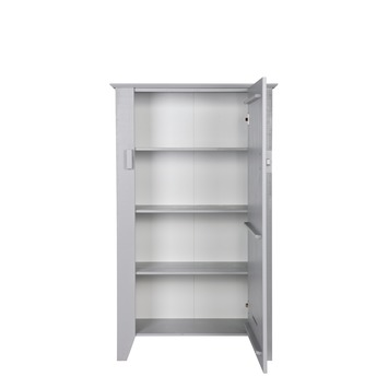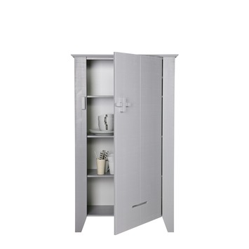 De WOOOD opbergkast Gijs (hxbxd) 142x85x37 cm is een lage opberger met een stoere massief houten vergrendeling. De kast is voorzien van 3 spaanplaat legplanken bekleedt met folie, solide metalen scharnieren en de kast is gemaakt van massief grenen (m.u.v. de 3 legplanken), gelakt in de kleur betongrijs met een bezaagde afwerking. Door een andere manier van zagen, dwars over de houtnerf, krijgt de kast een unieke uitstraling, waardoor er een doorleefd uiterlijk ontstaat. Deze kast is leuk in iedere ruimte, de kinderkamer, de woonkamer, gang/hal en/of de studeerkamer. Kast Gijs is ook in de kleur wit en zwart gelakt verkrijgbaar.
