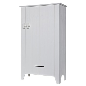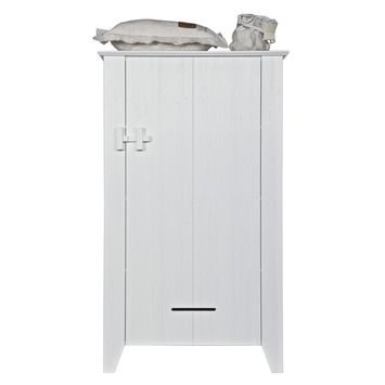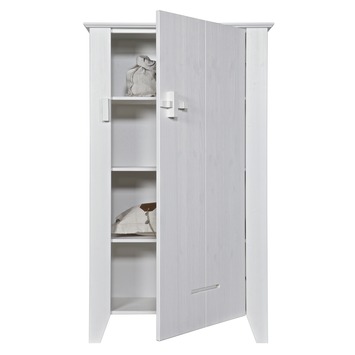 De WOOOD boerenkast Guus wits is een lage opberger met een stoere massief houten vergrendeling. De kast is voorzien van 3 legplanken, solide metalen scharnieren en gemaakt van massief grenen, gespoten in de kleur wit met een geborstelde afwerking. Bij het borstelen van grenen meubelen wordt de nerf sterk geaccentueerd en ontstaat een doorleefd oppervlak. Deze kast is leuk in iedere ruimte, de kinderkamer, de woonkamer en/of de studeerkamer. De afmetingen van de kast zijn (bxhxd): 85x142x38 cm.