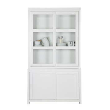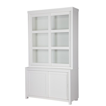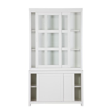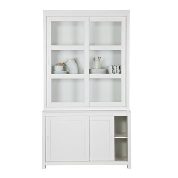 De WOOOD buffetkast Wessel (hxbxd) 215x120x49 cm is een reuze opberger en laat zien wat voor fraaie spullen je in huis hebt. De kast is voorzien van 2 schuifdeuren met gehard veiligheidsglas met daarachter 3 massief grenen legplanken en aan de onderzijde 2 greeploze schuifdeuren met achter elke deur 1 massief grenen legplank. De kast is gemaakt van massief wit gelakt FSC gecertificeerd grenenhout, gecombineerd met grenen legplanken en heeft een geschuurde afwerking ondergaan. Bij het borstelen van grenen meubelen wordt de nerf sterk geaccentueerd en ontstaat een doorleefd oppervlak. De achterwand is van wit gelakt MDF.
