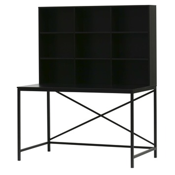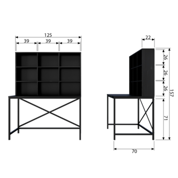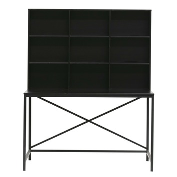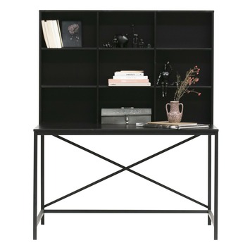 Bureau Elwin, uit de collectie van WOOOD, is een stoer, industrieel meubel. Bureau Elwin, (hxbxd) 157x125x70 cm, is perfect te gebruiken als werkplek, maar ook als meubel in de gang of huiskamer. Bureau Elwin is gemaakt van zwart afgelakt geschuurd grenen. Het stalen buisframe onderstel met zwarte poedercoat zorgt voor een moderne, industriële uitstraling. Bureau Elwin heeft negen opbergvakken met ieder een hoogte van 25,7 cm en breedte van 39,5 cm en een diepte van 21,6 cm. In dit royale opberggedeelte kun je boeken afwisselen met mooie woonaccessoires die gezien mogen worden, waardoor je je werkplek helemaal betrekt bij je interieur. De hoogte van het werkblad is 75 cm.