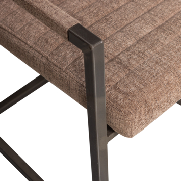 De stoel is bekleed met een stevige geweven stof die zacht aanvoelt en de stoel een luxe uitstraling geeft. Het onderstel van zwart metaal is strak vormgegeven en biedt stabiliteit. Deze combinatie van textuur en strakke lijnen maakt Bas tot een eigentijdse en veelzijdige stoel.