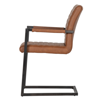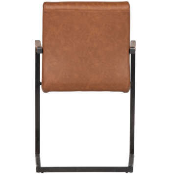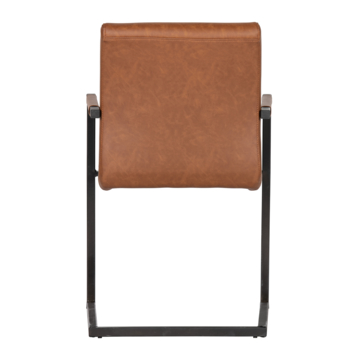 De stoel is bekleed met PU leer in cognac, een sterk en onderhoudsvriendelijk materiaal dat prettig aanvoelt en lang mooi blijft. Het metalen onderstel is afgewerkt met een zwarte poedercoating en biedt een stabiele basis met een industriële uitstraling.