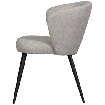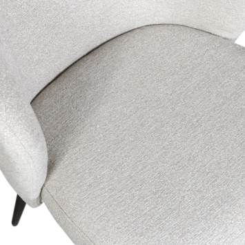 De Dolly eetkamerstoel heeft een comfortabele zit door de subtiel gebogen rugleuning. Dolly is afkomstig uit de collectie van het Nederlandse interieurmerk WOOOD. De wollige bouclé steekt mooi af tegen het matzwarte, houten potenframe.