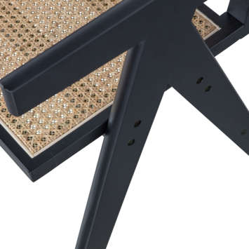 De stoel is vervaardigd uit FSC-gecertificeerd grenenhout, een houtsoort die bekend staat om zijn warme kleur, subtiele nerftekening en robuuste karakter. Het rattan vlechtwerk op de rugleuning vormt een luchtig contrast met het stevige houten frame, wat zorgt voor comfort en stijl in één.