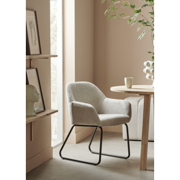 De Nadia eetkamerstoel heeft een comfortabele zit door de kuipvormig zitting. Nadia is afkomstig uit de collectie van het Nederlandse interieurmerk WOOOD en heeft een slank metalen sledepoot voor een luchtig design.