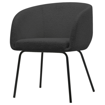 De Noelle eetkamerstoel heeft een slank metalen onderstel met een matzwarte poedercoating. De zitting is bekleed in een antraciete bouclé stof met een Martindale van 100.000. Dat maakt de eetkamerstoel zeer geschikt voor intensief woongebruik.