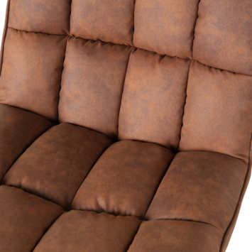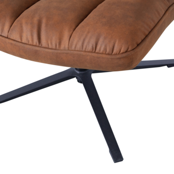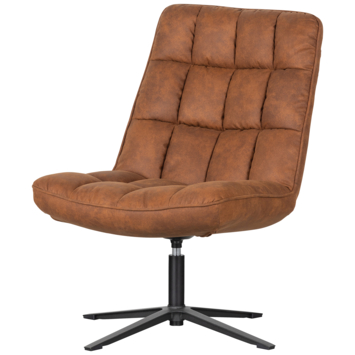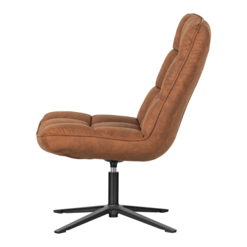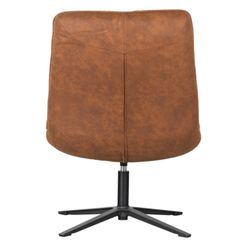 Deze comfortabele fauteuil Dirkje uit de collectie van het Nederlandse merk WOOOD is uitgevoerd in een cognackleurige PU lederlook. Het zwart metalen onderstel heeft een stabiele vierpoot en draaifunctie. Dirkje heeft een zachte zit en comfortabele zitkuil. De hoge rugleuning biedt stabiliteit in de rug wat zorgt voor extra zitcomfort.